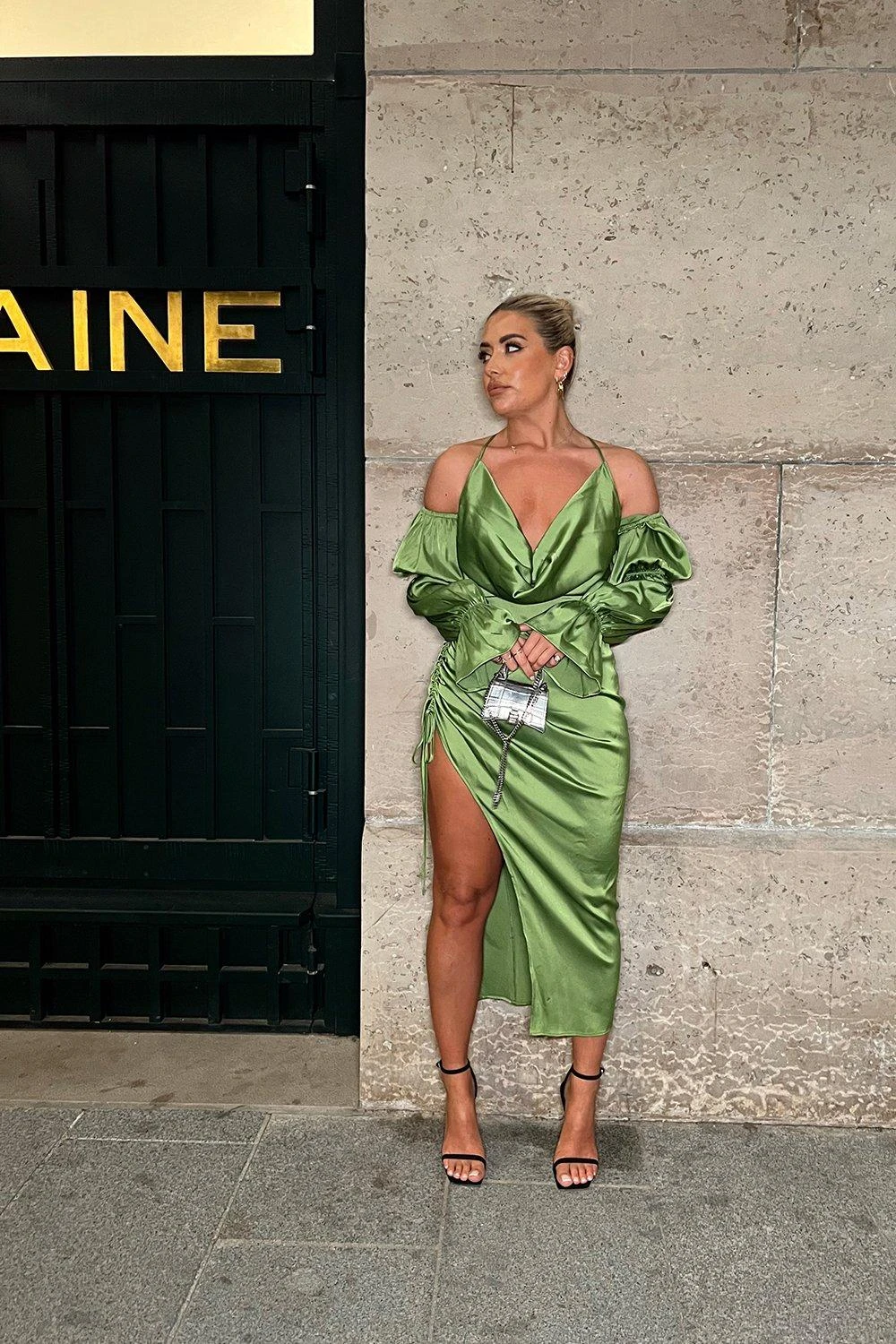 Be the first to review “Alisha LeMay Satin Puff Sleeve Cowl Neck Midi Dress” Cancel reply
