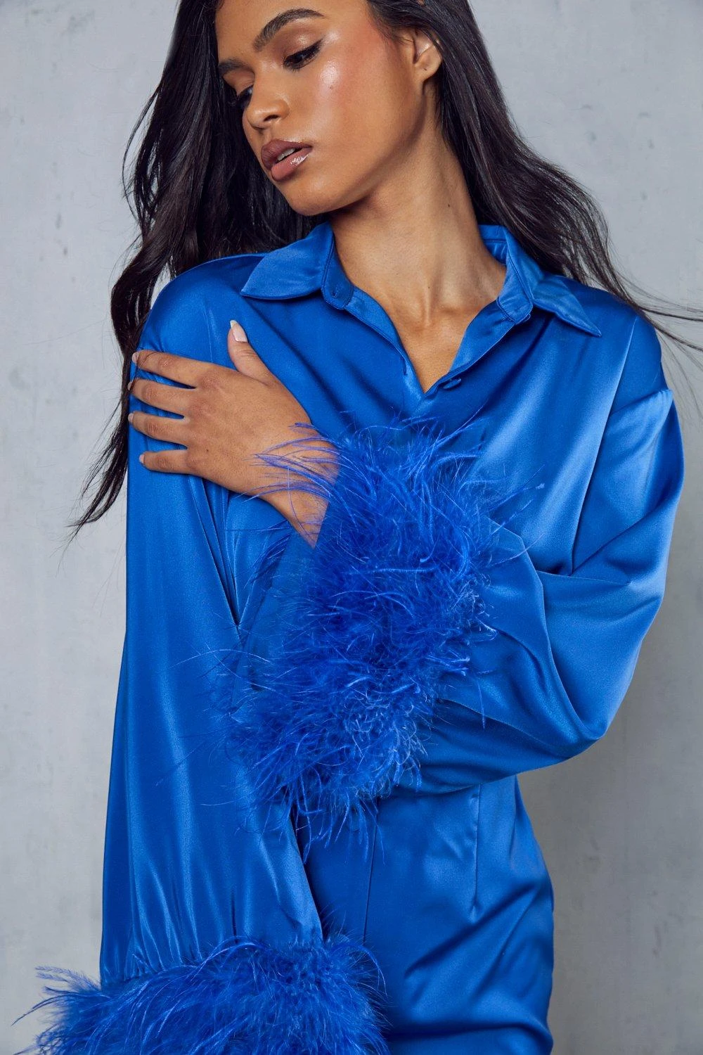 Be the first to review “Premium Satin Flute Sleeve Feather Shirt Dress” Cancel reply